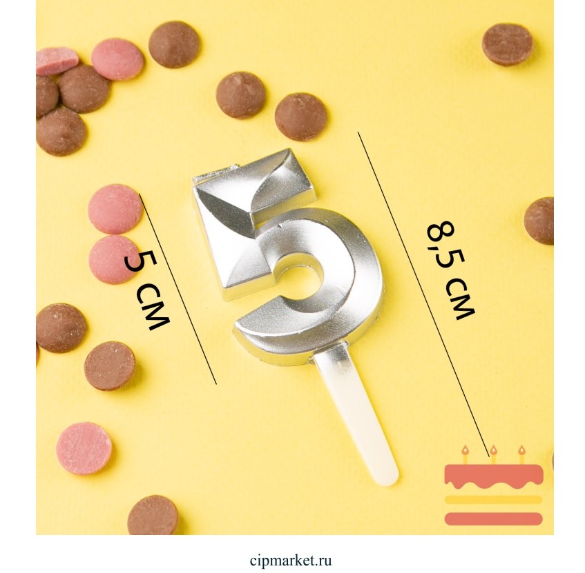 Свеча в торт цифра "5" Серебро. Высота 8,5 см