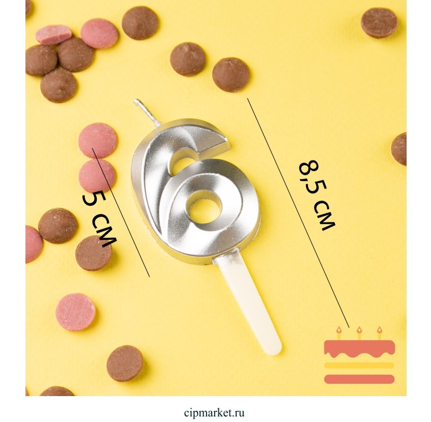 Свеча в торт цифра "6" Серебро. Высота 8,5 см